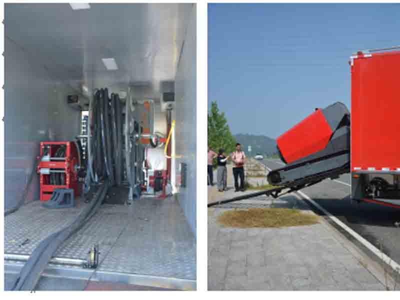 移動排水泵站及液壓系統(tǒng)放置室:車廂中段用于停放液壓裝置、液壓油箱及放置油管絞盤。車廂后門為下開式,行車時作為后門,保護車內(nèi)設施,當子車下車時,可作為其階梯,使子車平穩(wěn)上下車。
